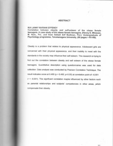 Obesity is a problem that relates to physical appearance. Adolescent girls are concerned With their phySical appearance, and their inability to meet with the standards in the society may influence their self esteem. This research is trying to find out the correlation between obesity and self esteem of the obese female teenagers. Quantitative description using questionnaires was used for data collection. Data analysis was conducted by Pearson Correlation Technique. The result indicates score at 0.495 (p = 0.495; p>0.05) at correlation point of -0,001 (r = -0,001). This Significant correlation maybe influenced by other factors such as parental relationships and subjects' competencies “in other areas, ;which compensate their obesity.