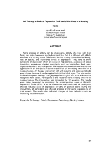 Aging process on elderly can be challenging. Elderly who lives with their family can enjoy happiness and independent live. But, it is different with elderly who lives in a nursing home. Elderly who live in a nursing home often feel lonely, lack of activity, and experience stress to depression. They tend to show symptoms of depression which are sense of helplessness, avoidance of social interaction, experience physical complaints such as headaches, back pain, digestive disorders, and indisgestion. This research is aimed to know whether the application of art therapy can reduce depression on the elderly who lives in a nursing homes. Art therapy intervention with with drawing and coloring methods were chosen because it can be applied to individual of all ages. This intervention is aimed to express feelings, changing negative thoughts, and to be able to more recognize them selves. Participants of this research were 3 elderly who live in nursing homes. The intervention was conducted for 12 sessions. The results were being measured by comparing the pretest-posttest score of Geriatric Depression Scale (GDS). After the intervention was conducted, all participants showed reducing score of depression on GDS on posttest score. During the intervention, all participant also showed process of increasing expressions on their artwork. The results also indicated changes of their behaviors such as increasing social interaction.