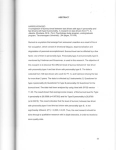 Wongso, Harris (2003) Perbandingan tingkat burnout antara supir taksi dengan kepribadian tipe A supir taksi dengan tipe kepribadian B (Suatu studi pada supir taksi PT X, Jakarta). Skripsi thesis, Universitas Tarumanagara.