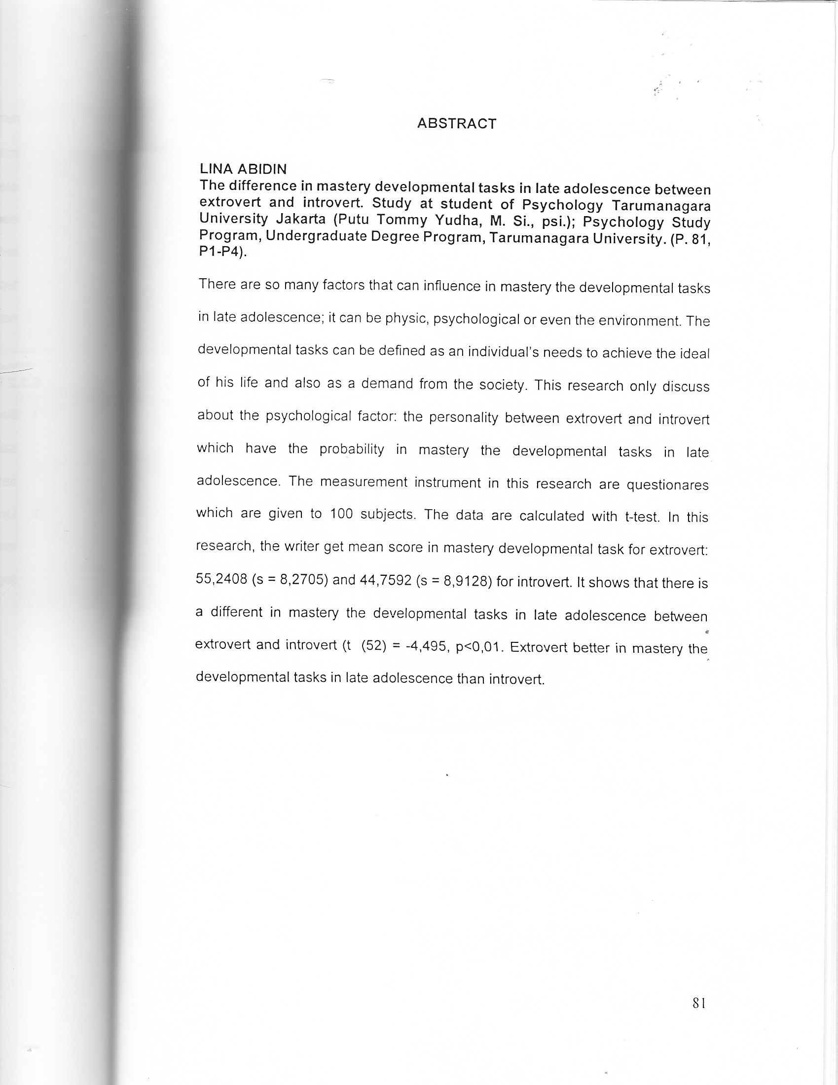 There are so many factors that can influence in mastery the developmental tasks in late adolescence; it can be physic, psychological or even the environment. The developmental tasks can be defined as an individual's needs to achieve the ideal of his life and also as a demand from the society. This research only discuss about the psychological factor: the personality between extrovert and introvert which have the probability in mastery the developmental tasks in late adolescence. The measurement instrument in this research are questionares which are given to 100 subjects. The data are calculated with t-test. In this research, the writer get mean score in mastery developmental task for extrovert: 552408 (3 = 82705) and 447592 (3 = 89128) for introvert. lt shows that there is a different in mastery the developmental tasks in late adolescence between extrovert and introvert (t (52) = 4,495, p<0,01. Extrovert better in mastery the, developmental tasks in late adolescence than introvert.