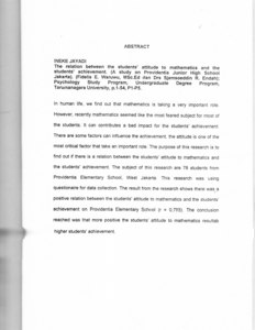 In human life, we find out that mathematics is taking a very important role. However, recently mathematics seemed like the most feared subject for most of the students. lt can contributes a bad impact for the students' achievement. There are some factors can influence the achievement, the attitude is one of the most critical factor that take an important role. The purpose of this research is to find out if there is a relation between the students' attitude to mathematics and the students' achievement. The subject of this research are 78 students from Providentia Elementary School, West Jakarta. This research was using questionaire for data collection. The result from the research shows there wasga positive relation between the students' attitude to mathematics and the students' achievement on Providentia Elementary School (r = 0,793). The conclusion reached was that more positive the students' attitude to mathematics resultab higher students' achievement.