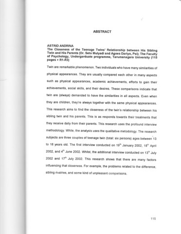 Twin are remarkable phenomenon. Two individuals who have many similarities of physical appearances. They are usually compared each other in many aspects such as physical appearances, academic achievements, efforts to gain their achievements, social skills, and their desires. These comparisons indicate that twin are (always) demanded to have the similarities in all aspects. Even when they are children, they're always together with the same physical appearances. This research aims to find the closeness of the twin's relationship between his sibling twin and his parents. This is as responds towards their treatments that they receive daily from their parents. This research uses the profound interview methodology. While, the analysis uses the qualitative metodology. The research subjects are three couples of teenage twin (total: six persons) ages between'13 to 18 years old. The nrst interview conducted on 19th January 2002, 18… April 2002, and 4… June 2002. Whilst, the additional interview conducted on 13th July 2002 and 17th July 2002. This research shows that there are many factors influencing that closeness. For example, the problems related to the difference, sibling rivaln'es, and some kind of unpleasant comparisons.