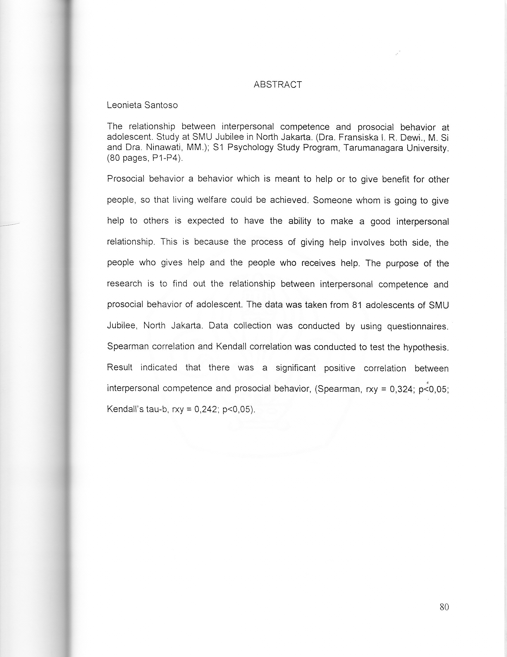 Prosocial behavior a behavior which is meant to help or to give benefit for other people, so that living welfare could be achieved. Someone whom is going to give help to others is expected to have the ability to make a good interpersonal relationship. This is because the process of giving help involves both side, the people who gives help and the people who receives help. The purpose of the research is to find out the relationship between interpersonal competence and prosocial behavior of adolescent. The data was taken from 81 adolescents of SMUJubilee, North Jakarta. Data collection was conducted by using questionnaires. Spearman correlation and Kendall correlation was conducted to test the hypothesis. Result indicated that there was a significant positive correlation between interpersonal competence and prosocial behavior, (Spearman, rxy = 0,324; p<005; Kendall's tau-b, rxy : 0,242; p<0,05).
