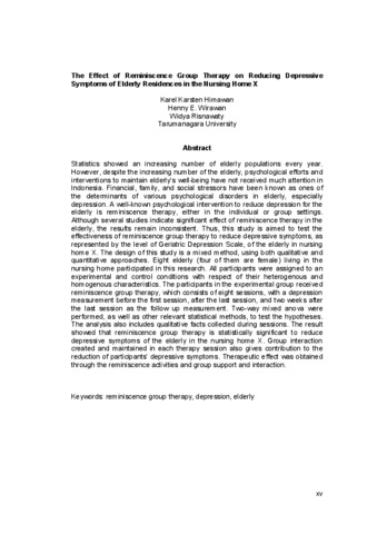 Hirmawan, Karel Karsten (2014) Efektivitas Reminisce Group Therapy untuk Mengurangi Indikasi Depresi pada Lanjut Usia di Panti Wreda X. Masters thesis, Universitas Tarumanagara.