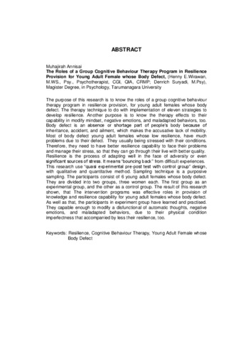 "The purpose of this research is to know the roles of a group cognitive behaviour therapy program in resilience provision, for young adult females whose body defect. The therapy technique to do with implementation of eleven strategies to develop resilience. Another purpose is to know the therapy effects to their capability in modify mindset, negative emotions, and maladapted behaviors, too. Body defect is an absence or shortage part of people’s body because of inheritance, accident, and ailment, which makes the accusative lack of mobility. Most of body defect young adult females whose low resilience, have much problems due to their defect. They usually being stressed with their conditions. Therefore, they need to have better resilience capability to face their problems and manage their stress, so that they can go through their live with better quality.