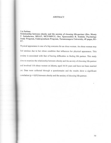 Sutisna, Lia (2004) Hubungan antara obesitas dengan kecemasan dalam memilih pasangan hidup pada perempuan dewasa awal. Skripsi thesis, Universitas Tarumanagara.