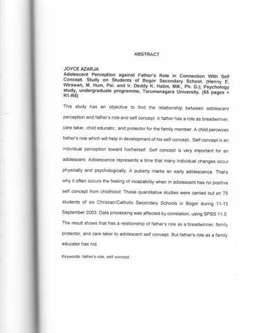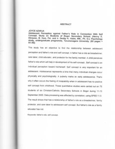 Azarja, Joyce (2004) Studi korelasi persepsi terhadap peran ayah dengan konsep kaitan diri pada remaja. Studi kasus pada pelajar SLTP di Bogor. Skripsi thesis, Universitas Tarumanagara.