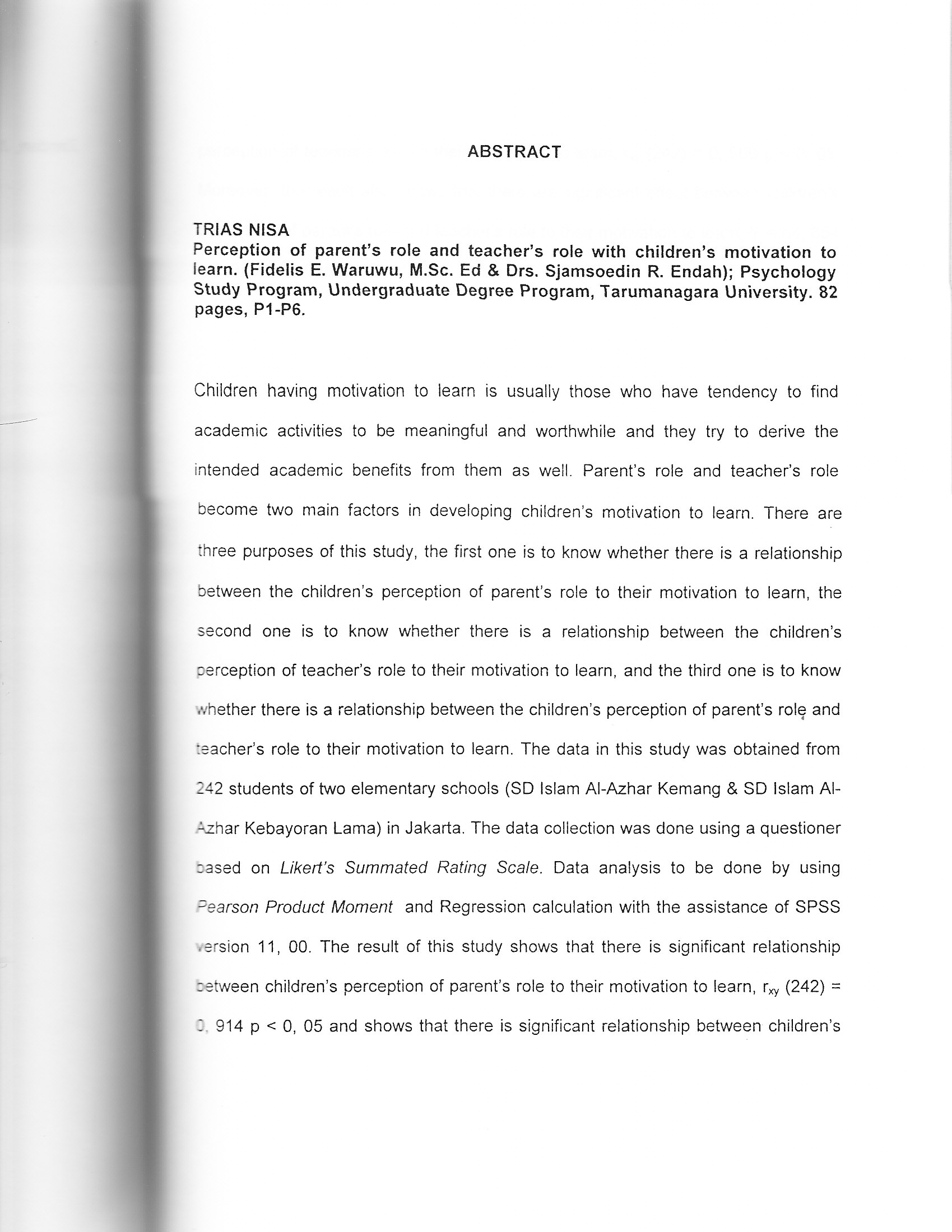 Nisa, Trias (2004) Persepsi terhadap peran orangtua dan peran guru kaitannya dengan motivasi belajar anak. Skripsi thesis, Universitas Tarumanagara.