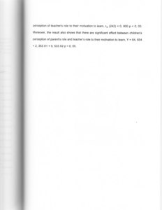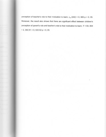 Children having motivation to learn is usually those who have tendency to find academic activities to be meaningful and worthwhile and they try to derlve the intended academic benefits from them as well. Parent's role and teacher's role become two main factors in developing childrens motivation to learn. There are three purposes of this study, the first one is to know whether there is a relationship between the children's perception of parent's role to their motivation to learn, the second one is to know whether there is a relationship between the children'sperception of teacher's role to their motivation to learn, and the third one is to knowwhether there is a relationship between the children's perception of parent's role and teacher's role to their motivation to learn. The data in this study was obtained from242 students of two elementary schools (SD lslam Al-Azhar Kemang & SD Islam Al- Azhar Kebayoran Lama) in Jakarta. The data collection was done using a questioner based on Likert's Summated Rating Scale. Data analysis to be done by usingpearson Product Moment and Regression calculation with the assistance of SPSS rersion 11, 00. The result of this study shows that there is significant relationship between children's perception of parent's role to their motivation to learn, rxy (242) 0,914 p < 0, 05 and shows that there is significant relationship between children's perception of teacher's role to their motivation to learn, rxy (242) = 0, 900 p < 0, 05. Moreover, the result also shows that there are significant effect between children's perception of parent's role and teacher's role to their motivation to learn, Y = 64, 654 +2,353X1+O,533X2p<0,05.