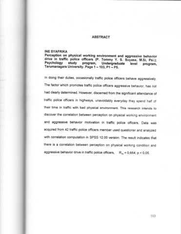 ln doing their duties, occasionally traffic police officers behave aggressively. The factor which promotes traffic police officers aggressive behavior, has not had clearly determined. However, discerned from the significant attendance of traffic police officers in highways, unavoidably everyday they spend half of their time in traffic with bad physical environment. This research intends to discover the correlation between perception on physical working environment and aggressive behavior motivation in traffic police officers. Data was acquired from 42 traffic police ofhcers member used questioner and anaiyzed with correlation computation in SPSS 12.00 version. The result indicates that there is a correlation between perception on physical working condition and aggressive behavior drive in traffic police officers, R,, = 0,664; p < 0,05.