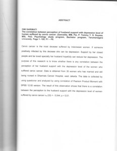 Cervix cancer is the most decease suffered by Indonesian women. lf someone positively infected by this decease she can be depression. Support by her closed people and be loved specially her husband hopefully can reduce her depression. The purpose of this research is to know whether there is any correlation between the perception of her husband support with the depression level of the women who suffered cervix cancer. Data is obtained from 35 women who has married and still being nursed in Dharmais Cancer Hospital, west Jakarta. The data is collected by using questioner and analyzed by using correlation of Pearson Product Moment with SPSS 12.00 version. The result of this Observation shows that there is a correlation between the perception to the husband support with the depression level of women suffered by cervix cancer rxy (33) = - 0,544, p < 0,01.