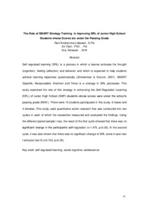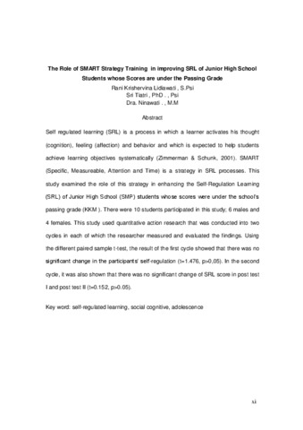 Self regulated learning (SRL) is a process in which a learner activates his thought (cognition), feeling (affection) and behavior and which is expected to help students achieve learning objectives systematically (Zimmerman & Schunk, 2001). SMART (Specific, Measureable, Attention and Time) is a strategy in SRL processes. This study examined the role of this strategy in enhancing the Self-Regulation Learning (SRL) of Junior High School (SMP) students whose scores were under the school’s passing grade (KKM ). There were 10 students participated in this study; 6 males and 4 females. This study used quantitative action research that was conducted into two cycles in each of which the researcher measured and evaluated the findings. Using the different paired sample t-test, the result of the first cycle showed that there was no significant change in the participants’ self-regulation (t=1.476, p>0,05). In the second cycle, it was also shown that there was no significant change of SRL score in post test I and post test II (t=0.152, p>0.05).