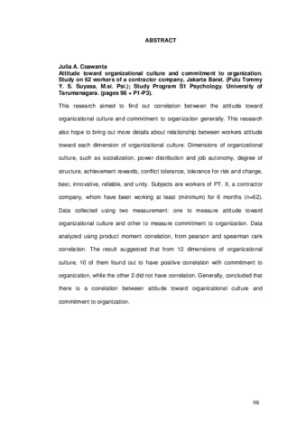 C, Julia Andriani (2005) Sikap terhadap budaya organisasi dan komitmen terhadap organisasi. Studi pada 62 karyawan perusahaan kontraktor, Jakarta Barat. Skripsi thesis, Universitas Tarumanagara.