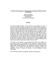 "In hormonal changes condition, sexual hormone of early adolescent is active. It causes their curiosity increases and affects them to intersect with pornography. In this kind of situation, pornography producers are existing in many social medias which are close to adolescents daily life, especially internet. The producer also claims that their product, which is pornography content, is as equal as a sex education. Although the idea of both sex education and pornography is about reproduction organs, but it does not mean that they are equal. Sex education is an education which means transferring knowledge about sex organ or human reproduction, how it works and the impact of its misuse (Soebagijo, 2008). The new information which is gained from sex education aims to provide basic establishment of attitude towards sex education itself. Strong messages carried by this new information provide a basic affective in judging something and determining attitude towards certain condition (Azwar, 2003).
