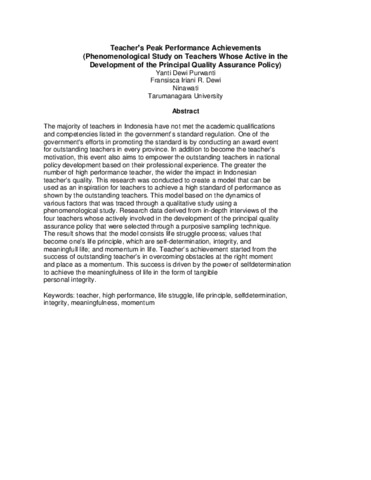 The majority of teachers in Indonesia have not met the academic qualifications and competencies listed in the government’s standard regulation. One of the government's efforts in promoting the standard is by conducting an award event for outstanding teachers in every province. In addition to become the teacher’s motivation, this event also aims to empower the outstanding teachers in national policy development based on their professional experience. The greater the number of high performance teacher, the wider the impact in Indonesian teacher’s quality. This research was conducted to create a model that can be used as an inspiration for teachers to achieve a high standard of performance as shown by the outstanding teachers. This model based on the dynamics of various factors that was traced through a qualitative study using a phenomenological study. Research data derived from in-depth interviews of the four teachers whose actively involved in the development of the principal quality assurance policy that were selected through a purposive sampling technique. The result shows that the model consists life struggle process; values that become one’s life principle, which are self-determination, integrity, and meaningfull life; and momentum in life. Teacher’s achievement started from the success of outstanding teacher’s in overcoming obstacles at the right moment and place as a momentum. This success is driven by the power of selfdetermination to achieve the meaningfulness of life in the form of tangible personal integrity.