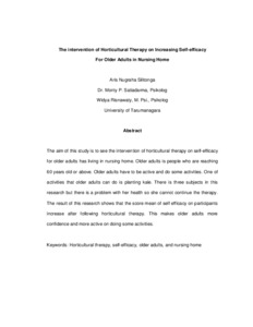 The aim of this study is to see the intervention of horticultural therapy on self-efficacy for older adults has living in nursing home. Older adults is people who are reaching 60 years old or above. Older adults have to be active and do some activities. One of activities that older adults can do is planting kale. There is three subjects in this research but there is a problem with her health so she cannot continue the therapy. The result of this research shows that the score mean of self efficacy on participants increase after following horticultural therapy. This makes older adults more confidence and more active on doing some activities.