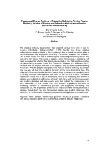 The creative industry development has created various new kind of job for creative individuals. Csikszentmihalyi (1975) founds that these creative individuals can work optimally in the condition of flow, a holistic sensation when a person becomes fully engage in an activity. Carpentier, Mageau, dan Vallerand (2012) then stated that flow is mediating the relationship between passion and subjective well-being. The choice of passion, either harmonious or obsessive, will have consequence whether flow being experienced or not, that resulting whether happiness being achieved or not. But Carpentier, Mageau, and Vallerand (2012) research was not explain flow with its full aspects, only autotelic experience being measured. With 88 graphic designers who work in creative industry as sample, this reseach will test the mediating function of the nine dimentions flow. The objective of the sample selection is to have a likely homogenous sample in terms of activity variation and cognitive skill used to perform the activity. The linear regression shows that in its full dimentions, flow is not mediating the relation of passion and subjective well-being, although both flow and harmonious passion can predict subjective well-being pretty well. But, indeed the measurement on each dimention of flow shows that only autotelic experience functions as mediating variable of harmonious passion and subjective well-being. The conclusion are, the experience of flow is not related with the individual choice of passion, though both flow and harmonious passion can lead to happiness. The exception is individual with obsessive passion whose happiness is unpredictable.