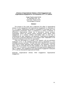 "The purpose of this study was to determine the effect of organizational climate on work engagement and organizational engagement on employees of PT. X in Jakarta. Organizational climate is a perception of how things are in the organizational environment, which is composed of a variety of elements or dimensions. Organizational climate has 9 dimensions, namely structure, responsibility, reward, risk, warmth, support, standards, conflict, identity. Work engagement, as a positive, fulfilling, work-related state of mind that is characterized by vigor, dedication, and absorption. Organizational engagement as the sense of personal attachment to the company itself, independent of the individual’s professional role within the organization.