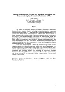 "The aim of this study is to enhance the previous study about relationship between flextime use and affective well-being, to know its impact on employee’s contextual performance in PT. A. Flextime use is defined as as employees’ actual enactment of that control to manage their start and end times of work, as well as break times according to their needs. We conceptualize contextual performance as frequency of employee’s behaviors that support the organizational, social, and