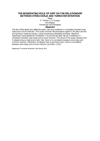 The aim of this study is to determine grit’s role as a moderator in correlation between stres kerja and turnover intention. This study involved 186 participants aged 21-36 years old who are working in banking industry, using convenience sampling technique. Based on hypothesis using Spearman Correlation, it found that grit play role as a moderator in correlation between stres kerja and turnover intention. The result of this study indicates that if subjects have a high level of grit, then there is no correlation between stres kerja and turnover intention. Otherwise, if subjects have a low level of grit, there is a correlation between stres kerja and turnover intention (p=0.008 < 0.05).