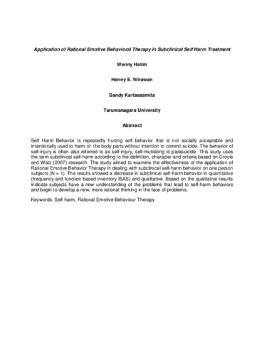 Halim, Wenny (2014) Penerapan rational emotive behavioral therapy pada penanganan subclinical self harm. Masters thesis, Universitas Tarumanagara.