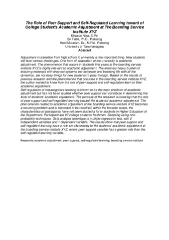 Adjustment in transition from high school to university is the important thing. New students will face various challenges. One form of adaptation at the university is academic adjustment. The phenomenon that occurs in students first years at the boarding service institute XYZ is highly relevant to academic adjustment. The relatively heavy burden of lecturing materials with drop out systems per semester and boarding life with all the dynamics, are not easy things for new students to pass through. Based on the results of previous research and the phenomenon that occurred in the boarding service institute XYZ, the author wanted to know how the role of peer support and self-regulation learn to their academic adjustment. Self-regulation of metacognitive learning is known to be the main predictor of academic adjustment but has not been studied whether peer support can contribute in determining the level of students’ academic adjustment. The purpose of the research is knowing that the role of peer support and self-regulated learning toward the students’ academic adjustment. The phenomenon related to academic adjustment at the boarding service institute XYZ becomes a recurring problem and is important to be resolved, within the broader scope, the characteristics of participants have not been studied a lot ie students in Higher Education of the Department. Participant are 97 college students freshmen. Sampling using non-probability techniques. Data analysis technique is multiple regression test, with 2 independent variables and 1 dependent variable. The results show that peer support and selfregulated learning have a role simultaneously to the students’ academic adjustment at the boarding service institute XYZ, where peer support variable has a greater role than the self-regulated learning variable.