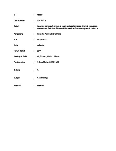 Aditya Indra Putra, Houwke (2011) Analisis pengaruh dimensi kualitas jasa terhadap tingkat kepuasan mahasiswa Fakultas Ekonomi Universitas Tarumanagara di Jakarta. Masters thesis, UNIVERSITAS TARUMANAGARA.