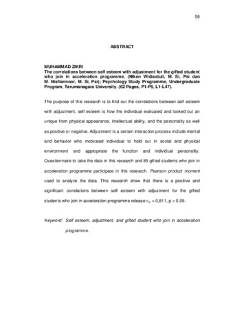 The purpose of this research is to find out the correlations between self esteem with adjustment, self esteem is how the individual evaluated and looked out an unique from physical appearance, intellectual ability, and the personality as well as positive or negative. Adjustment is a certain interaction process include mental and behavior who motivated individual to hold out in social and physical environment and appropriate the function and individual personality. Questionnaire to take the data in this research and 85 gifted students who join in acceleration programme participate in this research. Pearson product moment used to analyze the data. This research show that there is a positive and significant correlations between self esteem with adjustment for the gifted students who join in acceleration programme release rxy = 0,811, p < 0,05.