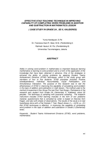 Ability in solving word problem in mathematics is important because learning mathematics is learning to solve problem and is a form of the application of the knowledge that have been obtained in advance. One of the strategies to enhance the ability of solving problems by applying Student Teams Achievement Divisions (STAD) techniques, which is the study group with members of four to five students. STAD principles included: Positive Interdependence, Individual Accountability, Equal Participation, and Simultaneous Interaction. The purpose of this research was to test the effectiveness of STAD in improving the capability of completing word problem in the topic of addition and subtraction in math lesson. The method used is the method of experiment One Group Pre test-Post Test Design. Participants of the research was student from Grade 2A, Elementary X, Kalideres, about 20 peoples. The technique of sampling with purposive sampling. The research instrument includes STAD learning modules in the form of wor problems material, questionnaire that is compiled by writer is based on theories from Kagan, and also with sheets of observations. The results of the study is to test hypotheses done with a Pair Sample T Test. Result shows (t = -4,618, p< .01) that STAD techniques is effective in improving the capability of completing word problem in the topic of addition and subtraction in Grade 2 (Elementary level).