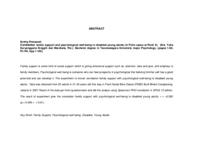 Primawati, Shinta (2007) Hubungan antara dukungan keluarga dan psychological well being pada penyandang cacat tubuh dewasa muda. Studi kasus Polio di Panti X. Skripsi thesis, Universitas Tarumanagara.
