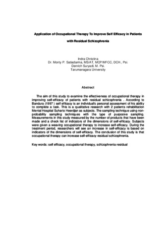 The aim of this study to examine the effectiveness of occupational therapy in improving self-efficacy of patients with residual schizophrenia . According to Bandura (1997 ) self efficacy is an individual's personal assessment of his ability to complete a task. This is a qualitative research with 2 patients rehabilitation Mental Hospital Suharto Heerdjan as subjects. The sampling technique using non-probability sampling techniques with the type of purposive sampling. Measurements in this study measured by the number of products that have been made and a check list of indicators of the dimensions of self-efficacy. Subjects were given a weaving occupational therapy to increase self-efficacy. During the treatment period, researchers will see an increase in self-efficacy is based on indicators of the dimensions of self-efficacy. The conclusion of this study is that occupational therapy can increase self-efficacy residual schizophrenia.