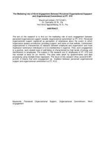 The aim of this research is to find out the mediating role of work engagement between perceived organizational support towards organizational commitment at PT. XYZ. Perceived organizational support explained as perception of employees about the extent to which organization assess contribution, providing support, and cares on their welfare. Commitment organizational is characteristic of relations between employee and organization and have implication termination individuals to fo its membership in organize. Then, work engagement is a positive, work-related state of well-being or characterized by high levels of energy and identification to employees. The subject in this research are 31 employees of PT. XYZ and has worked at least for six months, The data were taken by questionnaires and data processing using multiple linear regression. The result of this research show score β=0,481, p<0,05. It means that work engagement as mediator between perceived organizational support and organizational commitment at PT. XYZ.