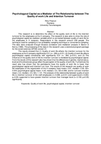 The results showed that (1) Quality of work life affects the intention turnover for the employees at the X company significantly 0.01 (r=-.289; p<0.01); (2) Quality of work life affects psychological capital consistently with significantly 0.01 (r= .364; p<0.01); and (3) The influence of the quality work of life for intention turnover is mediated by psychological capital. From the results of this research also has shown that the differences in gender, marital status, level and the directorate group affect the perception of the quality of work life. Furthermore the result also has shown that the participants have the quality of work life is lower than psychological capital and intention turn over. The results of the research are quality of work life employees of the organization of the X company have mean= 2.97, median= 3.00, SD= 0.540; psychological capital mean= 4.46, median= 3.5, SD=0.489; and for turnover intention mean= 3.2, median= 3.5, SD= 1.131. The analysis of the relationship between quality of work life to intention turnover of the staff employees (r=-0.288; p<0.01) and supervisor(r=-0.263; p<0.05) supported to have greater intention turnover than manager level (r=-0.159; p>0.05) significantly.