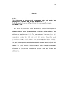 " The aim of this research is to see differences of interpersonal competence between male and female late adolescence. The subjects of this research is late adolescence, aged between 18-21. The total subjects of this research are 361 respondents, divided by 180 male and 181 female. Researcher used questionnaire which is based on Likert scale to collect the data of this research. The data was analyzed by Independent Samples Test with SPPS program 13th version, t = -1,039 and p = 0,299 > 0,05 which means there is no significant differences of interpersonal competence between male and female late adolescence.