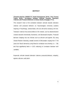 This research tried to find correlation between attitude towards television violence and prosocial behavior on Tarumanagara University students majoring in Psychology, Jakarta Barat, who are still active studying until now. Television violence has several effects to the viewers, such as desensitization (viewers became emotionally insensitive), and decreased empathy. Prosocial behavior (helping) has two motives such as altruism and egoism. By using Simple Random Sampling, sample consists of 200 people, ranging from 17-40 years old. Result derived by using Pearson correlation test showing rs = -.138, and from significancy test α = 0,05, indicating no correlation between both variables.