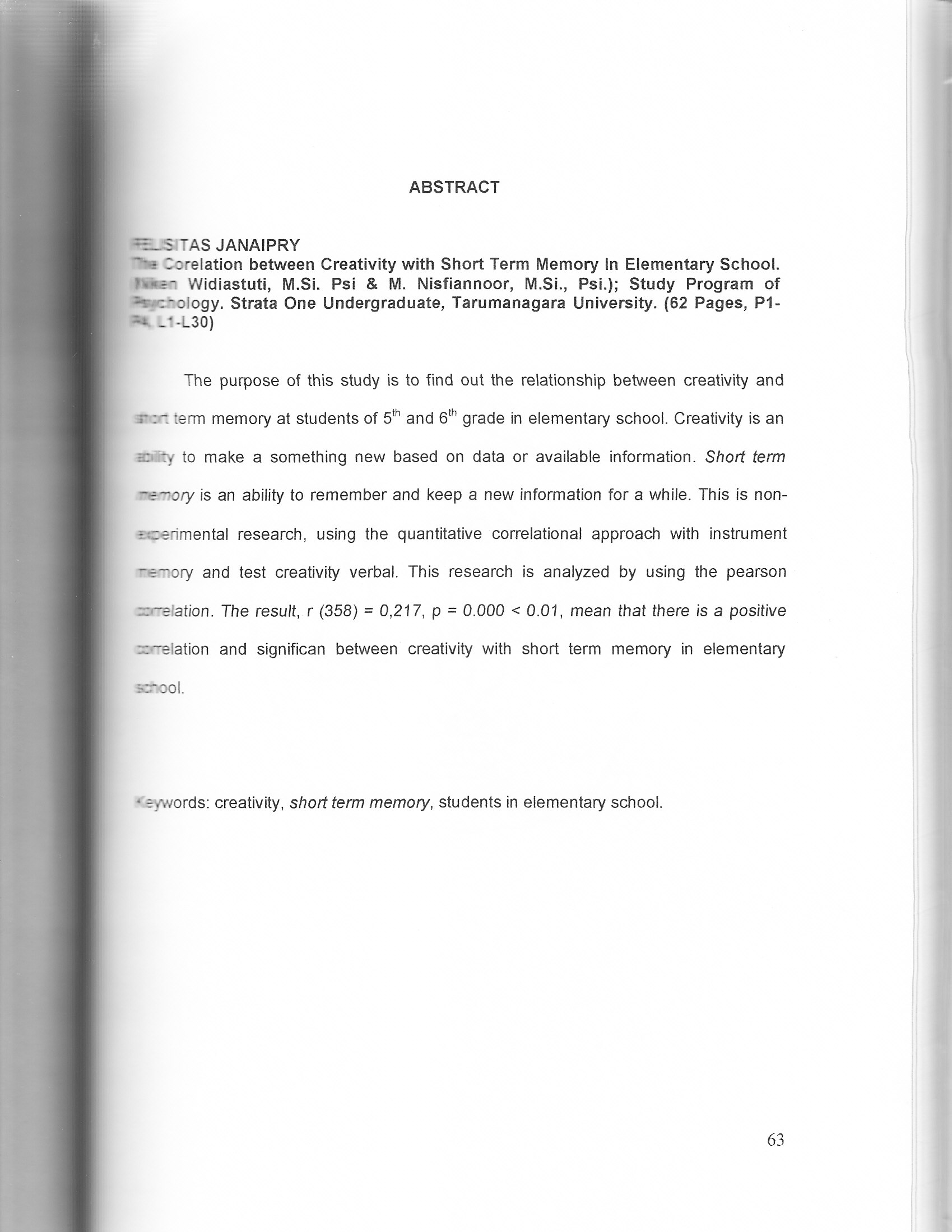 Janipry, Felisitas (2008) Hubungan antara kreativitas dengan kemampuan short term mempry pada siswa sekolah dasar. Penelitian pada Sekolah Dasar X dan Y di Jakarta. Skripsi thesis, Universitas Tarumanagara.