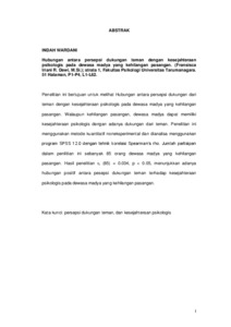 "Penelitian ini bertujuan untuk melihat Hubungan antara persepsi dukungan dari teman dengan kesejahteraan psikologis pada dewasa madya yang kehilangan pasangan. Walaupun kehilangan pasangan, dewasa madya dapat memiliki kesejahteraan psikologis dengan adanya dukungan dari teman. Penelitian ini menggunakan metode kuantitatif noneksperimental dan dianalisa menggunakan program SPSS 12.0 dengan tehnik korelasi Spearman’s rho. Jumlah partisipan dalam penilitian ini sebanyak 85 orang dewasa madya yang kehilangan pasangan. Hasil penelitian rs (85) = 0.034, p < 0.05, menunjukkan adanya hubungan positif antara pesepsi dukungan teman terhadap kesejahteraan psikologis pada dewasa madya yang kehilangan pasangan.