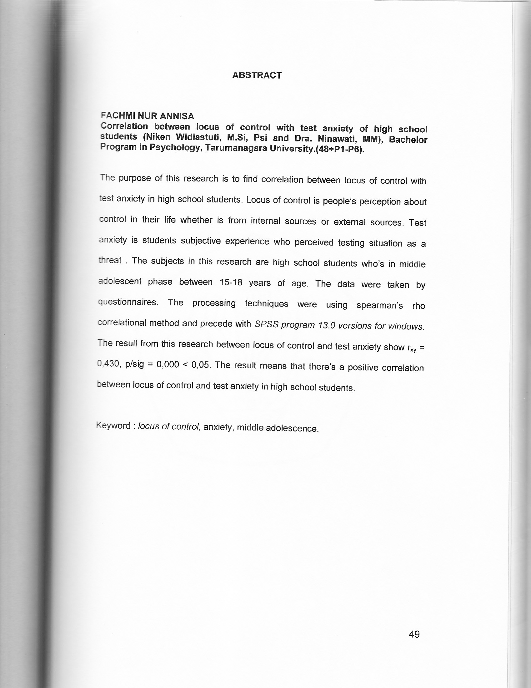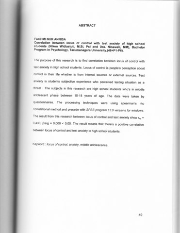 The purpose of this research is to find correlation between locus of control with -.est anxiety in high school students. Locus of control is people's perception about :ontrol in their life whether is from internal sources or external sources. Test E..-ixiety is students subjective experience who perceived testing situation as a . The subjects in this research are high school students who's in middle 2dolescent phase between 15-18 years of age. The data were taken by cuestionnaires. The processing techniques were using spearman's rho :orrelational method and precede with SPSS program 13.0 versions for windows. The result from this research between locus of control and test anxiety show rxy = 2 430, p/sig = 0,000 < 0,05. The result means that there's a positive correlation :etween locus of control and test anxiety in high school students.