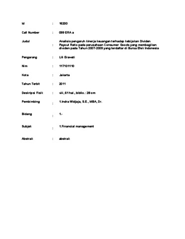 rawati, Lili (2011) Analisis pengaruh kinerja keuangan terhadap kebijakan Dividen Payout Ratio pada perusahaan Consumer Goods yang membagikan dividen pada Tahun 2007-2009 yang terdaftar di Bursa Efek Indonesia. Masters thesis, UNIVERSITAS TARUMANAGARA.
