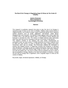 This research consists of two subjects who have similar characteristics as participants which are adult women in middle adulthood and whose husbands have an affair with other women. In order to regulate their anger, subjects were given intervention which was art therapy. This intervention enables the individuals to express their deepest emotion, to objectively visualize their problems, to decrease their self defense, to develop as well as to explore themselves. Anger was measured before and after using CAS (Clinical Anger Scale) by Snell, Gum, Shuck, Mosley, and Hite and graphic test. The result is being used as qualitative journal in order to see the progress of therapy. Based on the result and analysis of artworks, it results the fact that art therapy has a (significant) role to regulate anger on wives as the victims of infidelity.