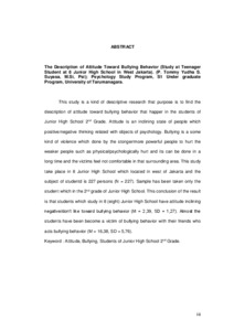 This study is a kind of descriptive research that purpose is to find the description of attitude toward bullying behavior that happer in the students of Junior High School 2nd Grade. Attitude is an inclining state of people which positive/negative thinking related with objects of psychology. Bullying is a some kind of violence which done by the stonger/more powerful people to hurt the weaker people such as physical/psychologically hurt and its can be done in a long time and the victims feel not comfortable in that surrounding area. This study take place in 8 Junior High School which located in west of Jakarta and the subject of studentd is 227 persons (N = 227). Sample has been taken only the student which in the 2nd grade of Junior High School. This conclusion of the result is that students which study in 8 (eight) Junior High School have attitude inclining negative/don’t like toward bullying behavior (M = 2,39, SD = 1,27). Almost the students have been become a victim of bullying behavior with their friends who acts bullying behavior (M = 16,38, SD = 5,76).