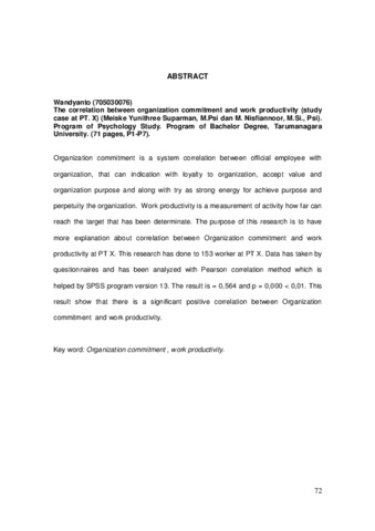 Wandyanto, Wandyanto (2008) Hubungan antara komitmen organisasi dan produktivitas kerja. Studi kasus pada PT X. Skripsi thesis, Universitas Tarumanagara.