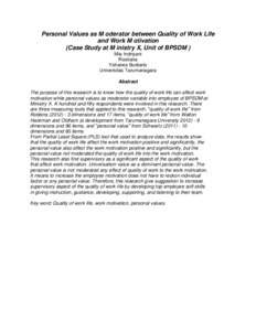 The purpose of this research is to know how the quality of work life can affect work motivation while personal values as moderator variable into employee of BPSDM at Ministry X. A hundred and fifty respondents were involved in this research. There are three measuring tools that applied to this research, “quality of work life” from Robbins (2012) - 3 dimensions and 17 items, “quality of work life” from Walton Hackman and Oldham (a development from Tarumanegara University 2012) - 9 dimensions and 96 items, and “personal value” from Schwartz (2011) - 10 dimensions and 80 items. From Partial Least Square (PLS) tool that used to analyze data, the results show that the quality of work life affect the work motivation positive and significantly, the personal value also affect the work motivation positive and significantly, but the personal value not moderated the quality of work life into the work motivation. This research also find supervisory as a significant aspect of the quality of work that affect work motivation. Universalism value as a dominant personal value. The personal value is not moderated any effect of quality of work to the work motivation. It means to increase the employee motivation does not have to reckon individual factor or any personal value. Therefore, this research give suggestion to increase supervisory aspect of the quality of work life by developing top employee soft skills in giving instruction, guidance, developing, supporting, and listening to their team.