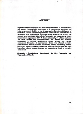 Organizations need employees who have strong commitment so the organization still survive. Organizational commitment is a psychological behaviour that influence a person's decision to stay in organization. Commitment influence by two factors, personal factor and organizational factor. Personal factor affected by personality, while organizational factor affected by organizational climate. This research aims to understand the effect of personality and organizational climate. This research aims to understand the effect of personality and organizational climate to commitment organization at PT X. Data is collected by 31 full-time employee. The result showed only conscientiousness that affected the normative commitment. In addition, organizational climate affected only normative commitment. Dimension of organizational climate that that affected normative commitment are structure, standard, and identity. Identity, responsibility, warmth, and conflict affected to affective commitment. The other result showed that there is an effect between conscientiousness and organizational climate to normative commitment.