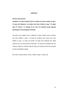 K., Anthony Kaya (2008) Validasi alat ukur kreativitas verbal untuk ibu yang memiliki anak usia dibawah 12 tahun. Skripsi thesis, Universitas Tarumanagara.