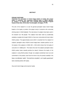 The aim of the research is to see the general perception about brand image based on the loyalty to product (the proper study of consumer who consumes drinking water in AQUA labeled). The total amount of subjects have been used in the research are 180 people. The subjects have been taken by accidentally sampling to people who bought AQUA or have ever consumed and known about AQUA product. The approximately score which is resulted from the research of subjects' perception about AQUA's brand image leans towards positive, but for the loyalty of the subjects is 0.5034 (SD = 0.25) which shows that the loyalty of consumer is in middle point. This means that even the subjects' perception about AQUA product leans towards positive but doesn't influence the loyalty of the subjects in using AQUA product though, but subjects sometimes have trust and commitment to the product, also have the intent to buy the product steadily in the future, but attributes “useful”, “the best than competitor”, and “quality guaranteed” leans towards positive with loyalty.
