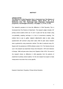 The research’s purpose is to know the difference in Child Popularity That is Conducted from The Patterns of Attachment. The research subject includes 187 primary school students which are 12 until 14 years old that are chosen using non-probability sampling technique in a form of convenience sampling. The method that is use to gather research attachment’s data is done using questionnaire with sortment using Likert scale, while for peer status research data is gathered by using sosiometric method. The data is analyzed using Chi-Square with the assistance of SPSS software version 15.0. The theories that are use in this research are attachment theory from Ainsworth, 1978 (from Solomon & George, 1999) and peer status theory from Papalia & Olds (1979). The result of the research shows no difference in child popularity from the patterns of attachment of primary school students. For the next research we expect to make measurement instrument that is more specific.