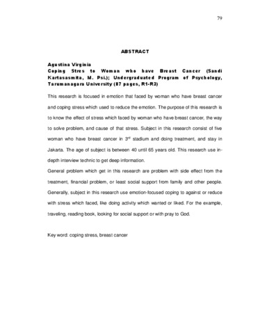Virginia, Agustina (2008) Coping stress pada perempuan yang menderita kanker payudara. Skripsi thesis, Universitas Tarumanagara.