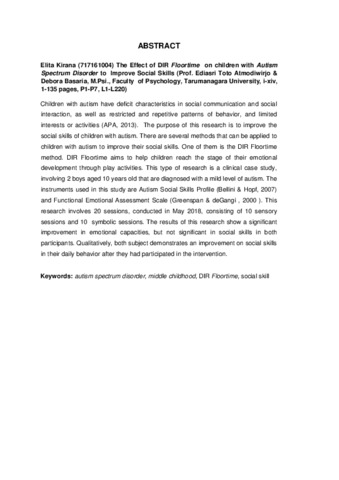 Kirana, Elita and Debora, Basaria (2018) Penerapan DIR Floortime Pada Anak dengan Autism Spectrum Disorder Untuk Meningkatkan Kemampuan Sosial. Masters thesis, Universitas Tarumanagara.