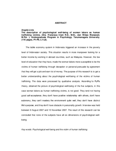 Livia, Angela (2008) Gambaran kesejahteraan psikologis pada tenaga kerja wanita sebagai korban perdagangan manusia. Skripsi thesis, Universitas Tarumanagara.